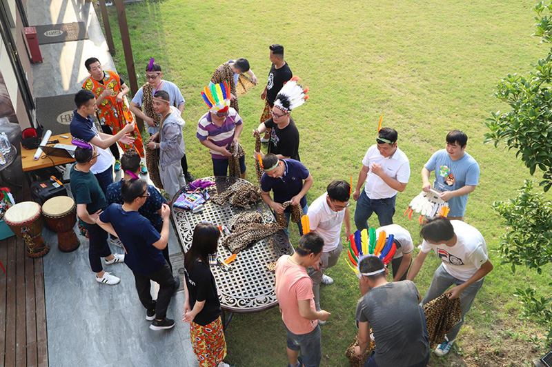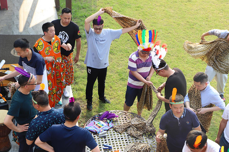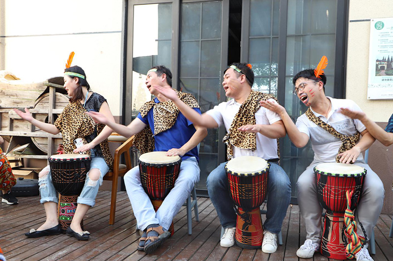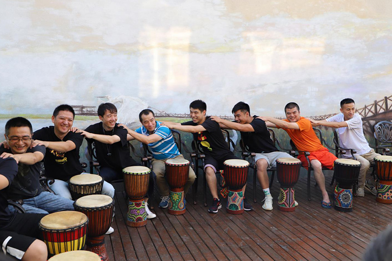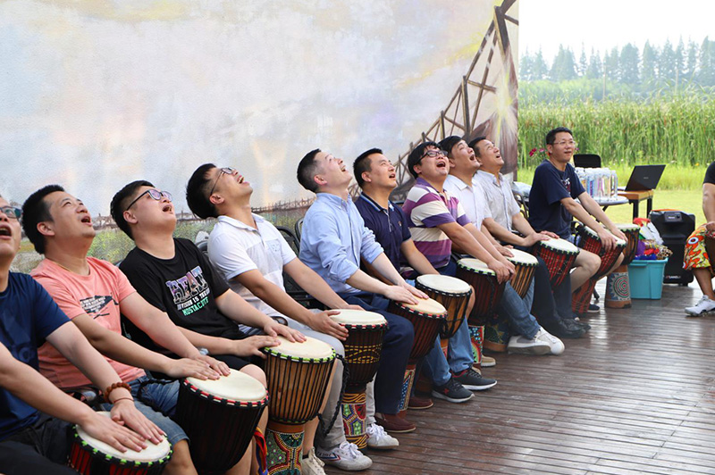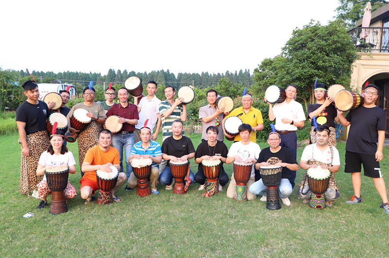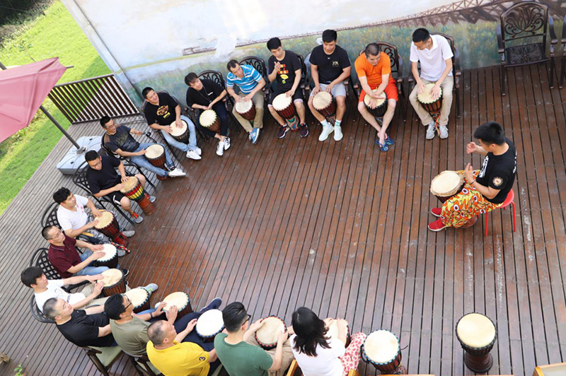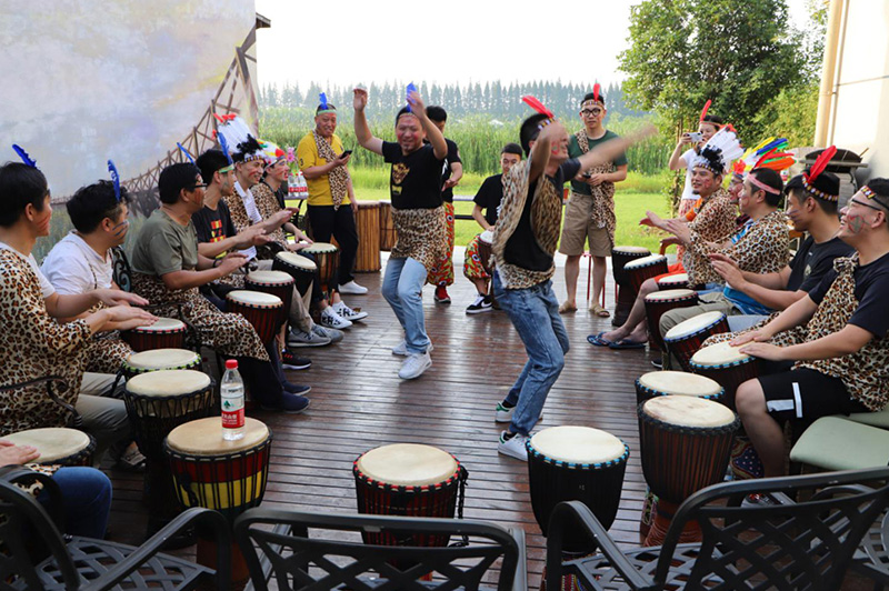 非洲鼓团建是模仿非洲部落情境,通过非洲鼓不同的节奏,使部落内部成员之间,部落与部落之间的配合,达成一种完美统一的效果。