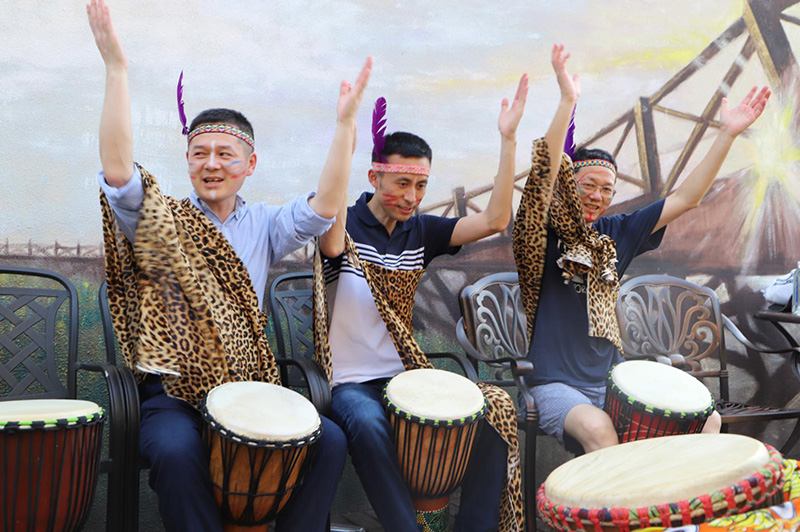 下午4点在主持人的带领下,班组长进入了“同心”、“同步”、“同鼓舞”《狂野非洲鼓》